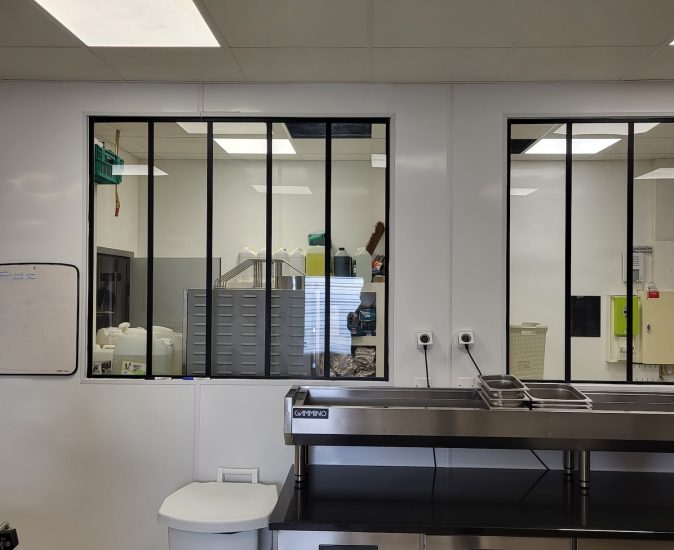 Il était impératif d’allier hygiène et fonctionnalité. Le choix des matériaux, notamment les cloisons lavables en PVC, était crucial pour répondre aux normes strictes de l’industrie alimentaire.